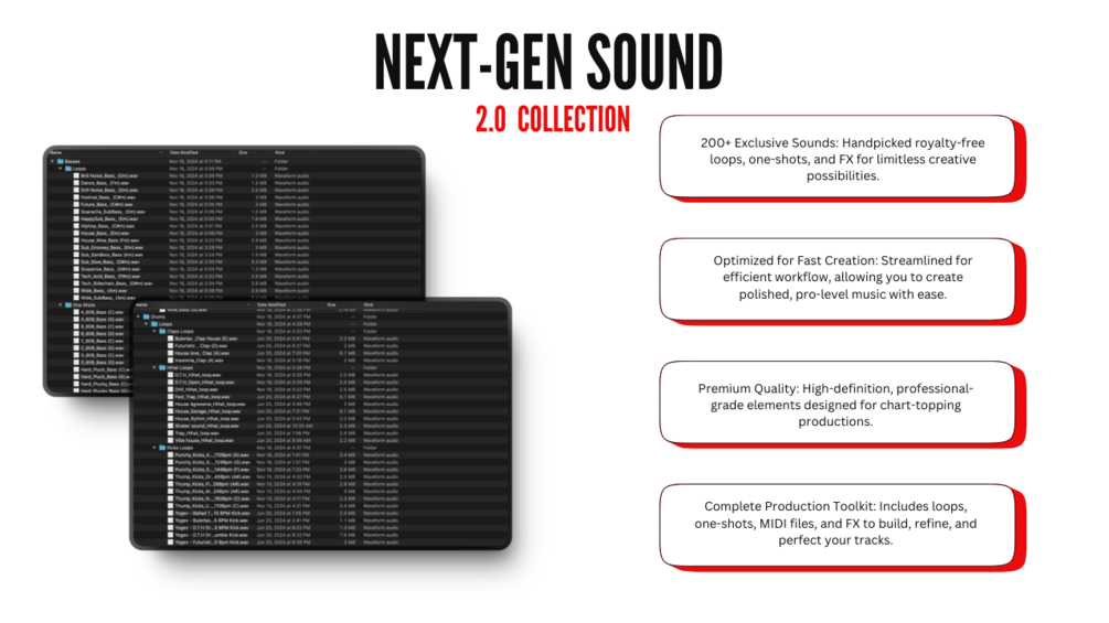 If you were to source, design, and organize this level of premium content on your own, it would take weeks—if not months—of time and effort. With Next-Gen Sound 2.0, you get a comprehensive, professionally crafted toolkit ready to elevate your tracks instantly.